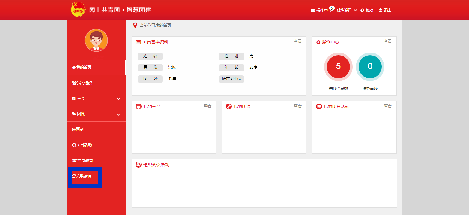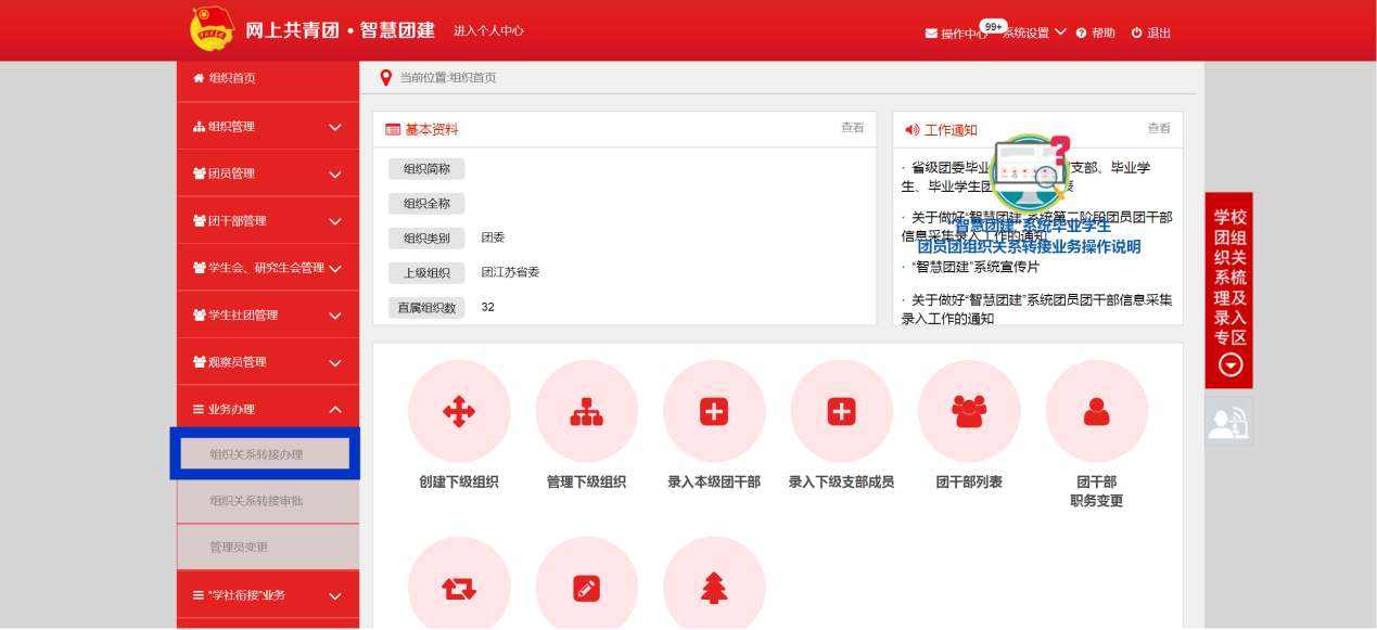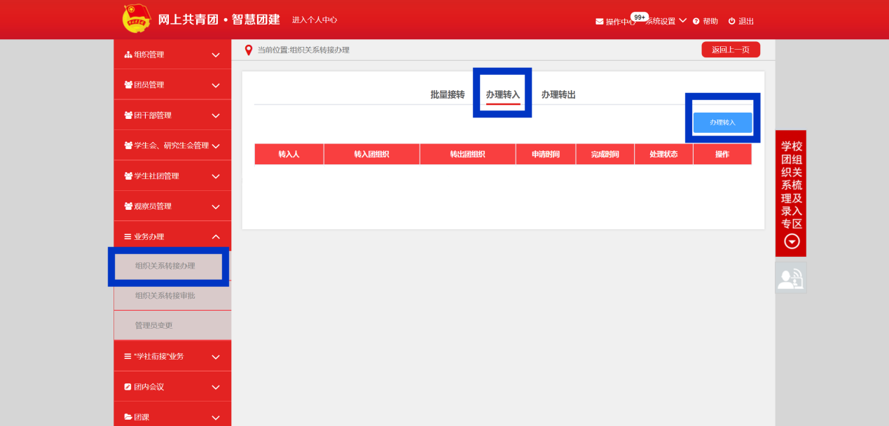 第一步:由新生原学校(单位)团组织登陆“智慧团建”信息系统网站,在左侧“业务办理”栏目中选择“组织关系转接办理”。