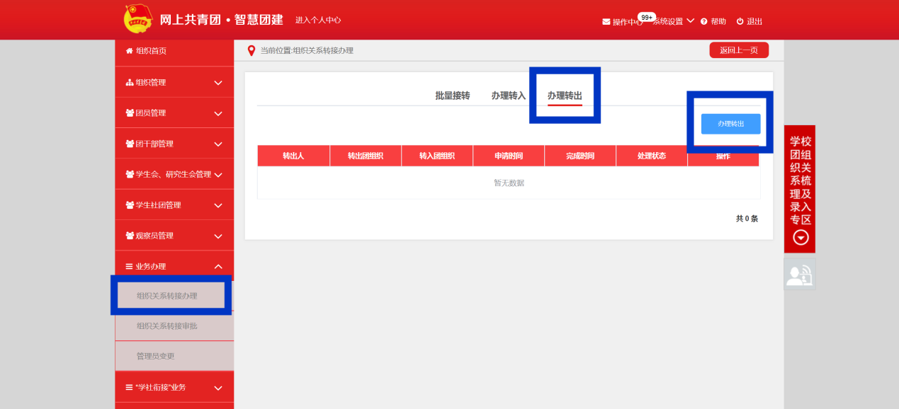 第二步:点击“组织关系转接办理”业务中的“办理转出”选项,并从“办理转出”栏目进入业务办理的界面。