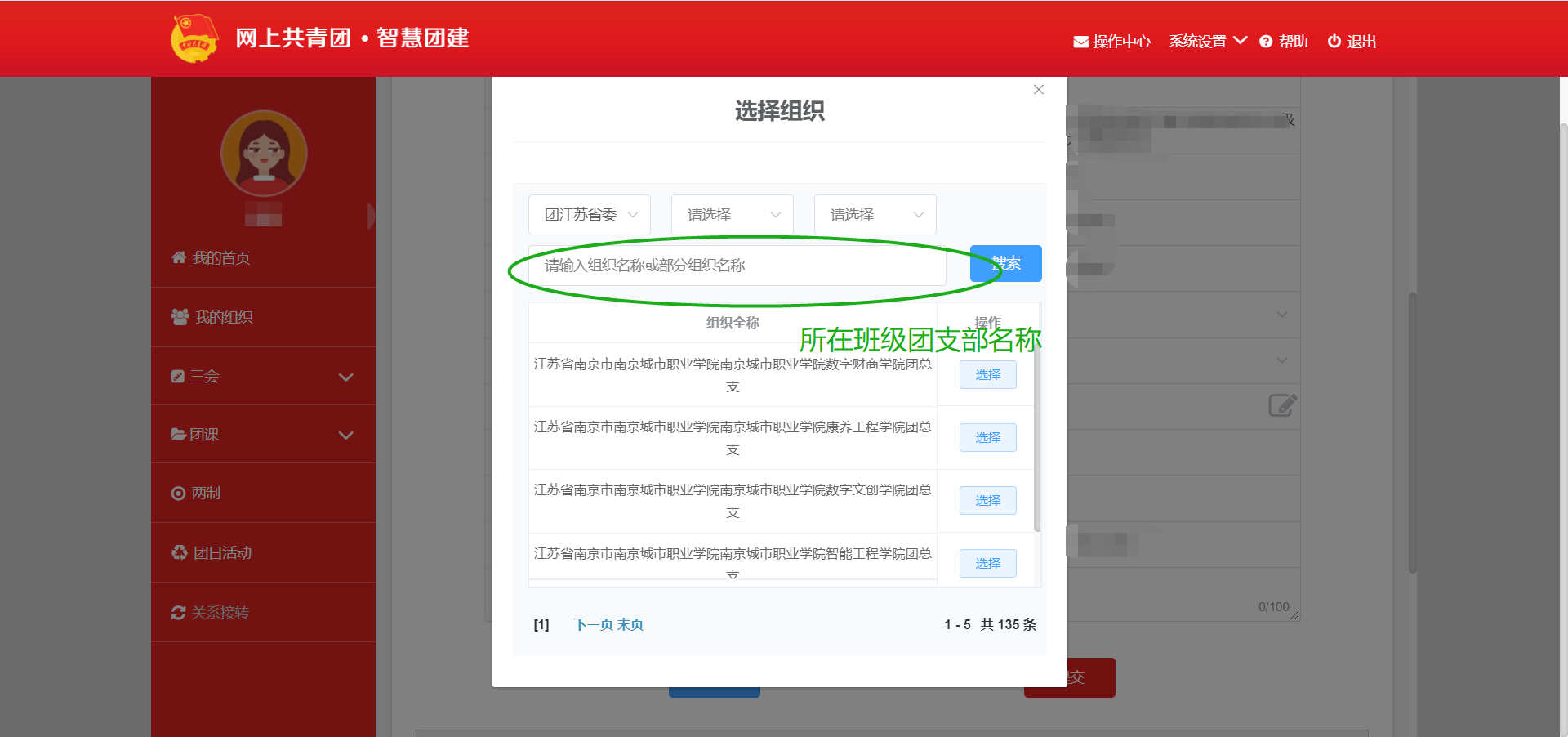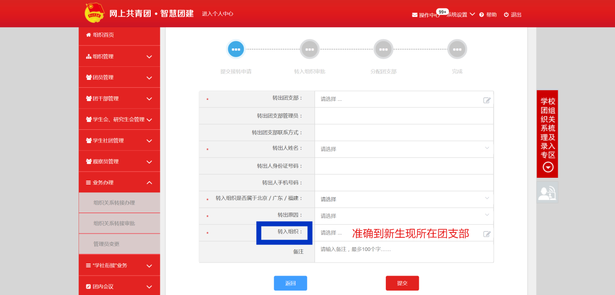 第三步:填写页面的相关信息,其中“申请转入组织”点击后选择自己所在班级团支部。点击提交后,待现所在团支部审批通过后,线上团组织关系转接完成。
