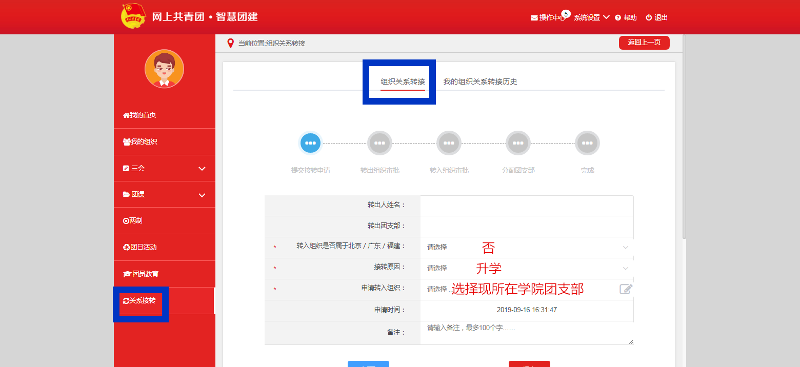 第三步:在提交转接申请的界面中,准确填写团员各项基本信息,在选择团员现所在团支部后,提交接转申请,待转入组织审批通过,线上团组织关系转接完成。