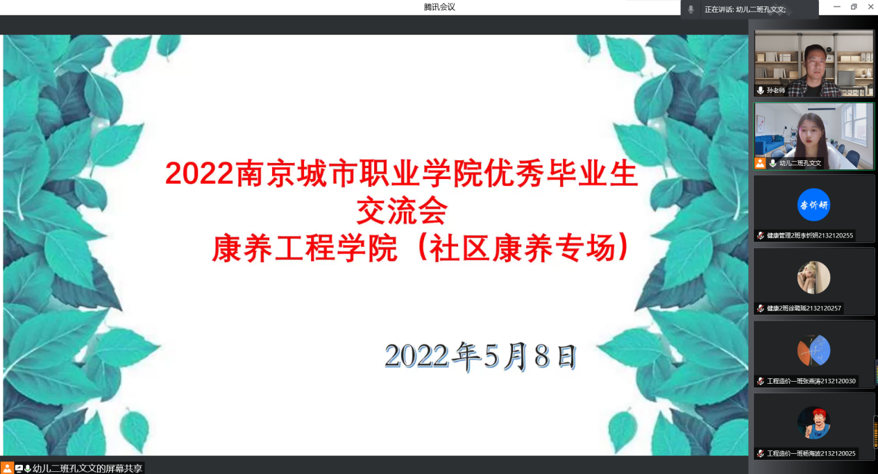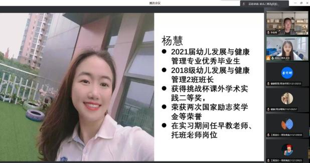 为做好2022届毕业生就业工作,激发学生的学习热情,帮助学生做好职业生涯规划,充分发挥优秀毕业生的模范作用,根据学校“职业教育活动周”的要求与布署,5月8日晚7:30,康养工程学院举办了社区康养专场优秀毕业生交流会,学院300名学生齐聚腾讯会议聆听了优秀毕业生的分享交流。本场交流会邀请了2021级老年服务与管理专业毕业生吴雅雯,2021届幼儿发展与健康管理专业的毕业生杨慧、杨婉滢三位同学从专业就业选择、实习应聘技巧、继续深造学习、个人规划发展等方面,结合自身经历与学弟学妹们分享了自己成长中的励志故事和心得体会。
