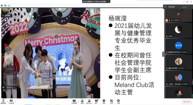 杨婉滢同学现就职于南京乐的文化有限公司,目前担任Meland Club活动主管职务。她介绍了在派对策划承接、星厨、艺术、舞会、换装写真、绘本荟等工作活动中的心得,并着重分享了对0-3岁婴幼儿阶段开展工作的心得。杨婉滢说“热爱这一行业你才会用心做好每一件事,才能更快乐的成长发展”。