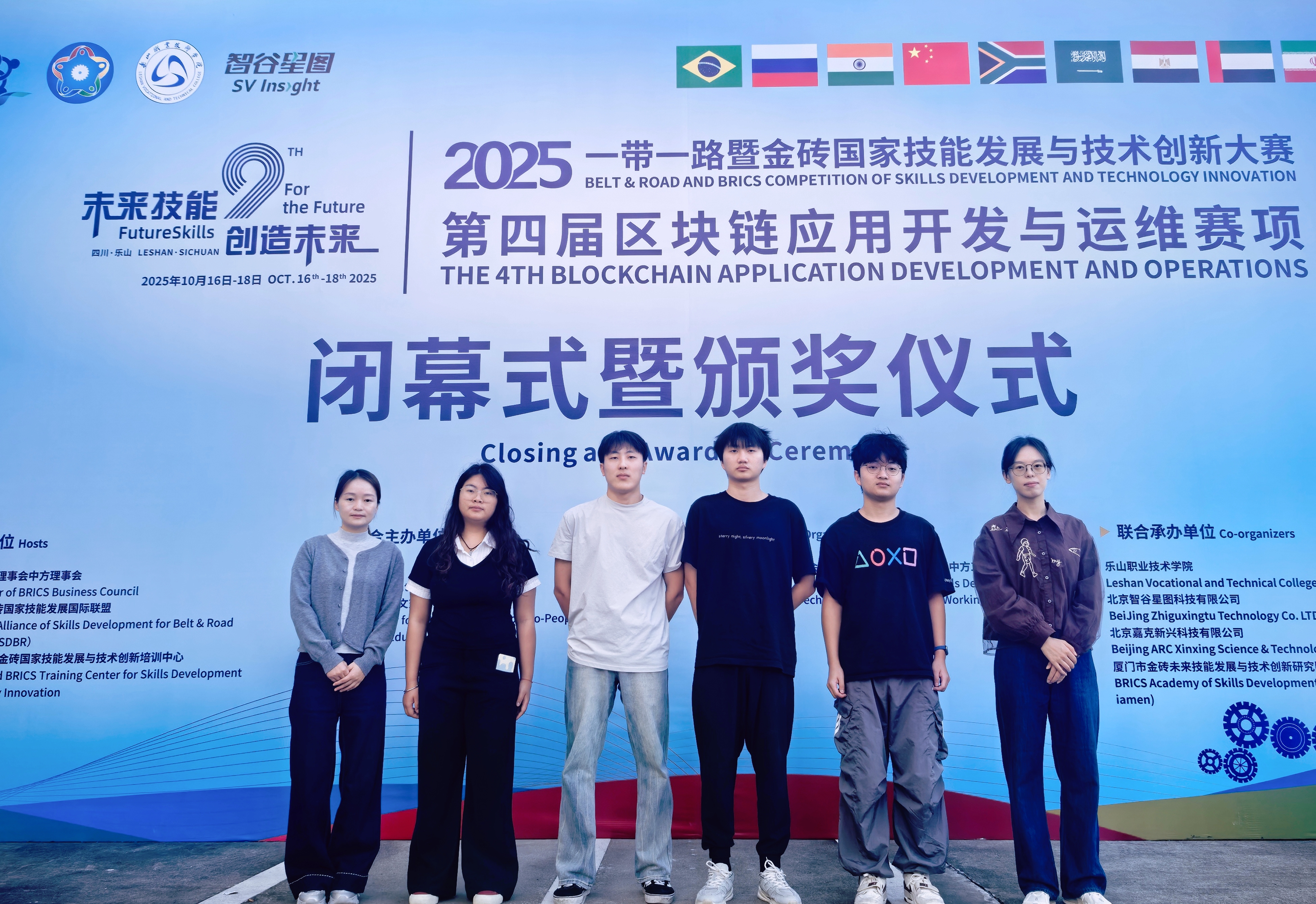 10月16日-19日,2025“一带一路”暨金砖国家技能发展与技术创新大赛之第三届区块链应用开发与运维赛项在乐山职业技术学院举办。来自全国9支本科参赛队、140支高职参赛队展开激烈角逐,问鼎在线智能工程学院参赛队伍表现出色,2024级计算机应用技术专业项誉和2024级云计算技术应用专业张安宝同学荣获二等奖,问鼎在线获“优秀组织奖”,桂超、朱志慧老师获优秀指导教师奖。