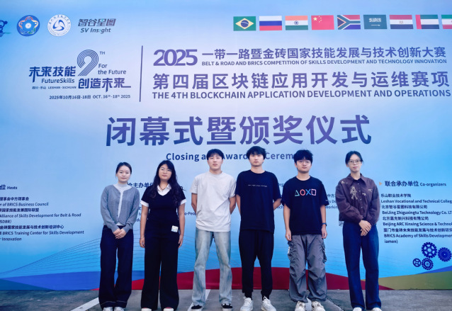 2025一带一路暨金砖国家技能发展与技术创新大赛之第四届区块链应用开发与运维赛项,于2025年10月16日—10月19日在乐山职业技术学院成功举办。来自全国154支队伍参赛,涵盖高职组和国际组,展开激烈角逐,智能工程学院的参赛队伍表现出色,项誉和张安宝荣获二等奖,问鼎在线(中国)获优秀组织奖,桂超、朱志慧两位教师获优秀指导教师奖。