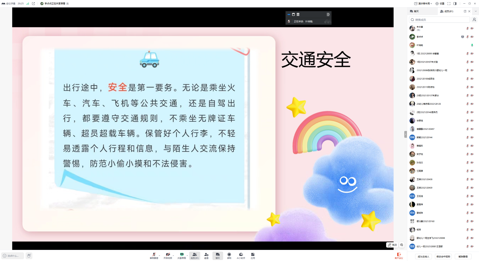 针对目前在校外实习岗位上的学生,学院坚持“离校不离教、放假不放松”的原则,通过腾讯会议、班级群和微信朋友圈等平台开展线上安全教育专题会议以及安全提醒。辅导员详细传达学校寒假安排及相关要求,重点强调实习期间的岗位安全、通勤安全、住宿安全及突发事件应对措施,并提醒学生保持与学校、实习单位和家长的密切联系,定期报送安全动态,确保安全教育无死角、全覆盖。