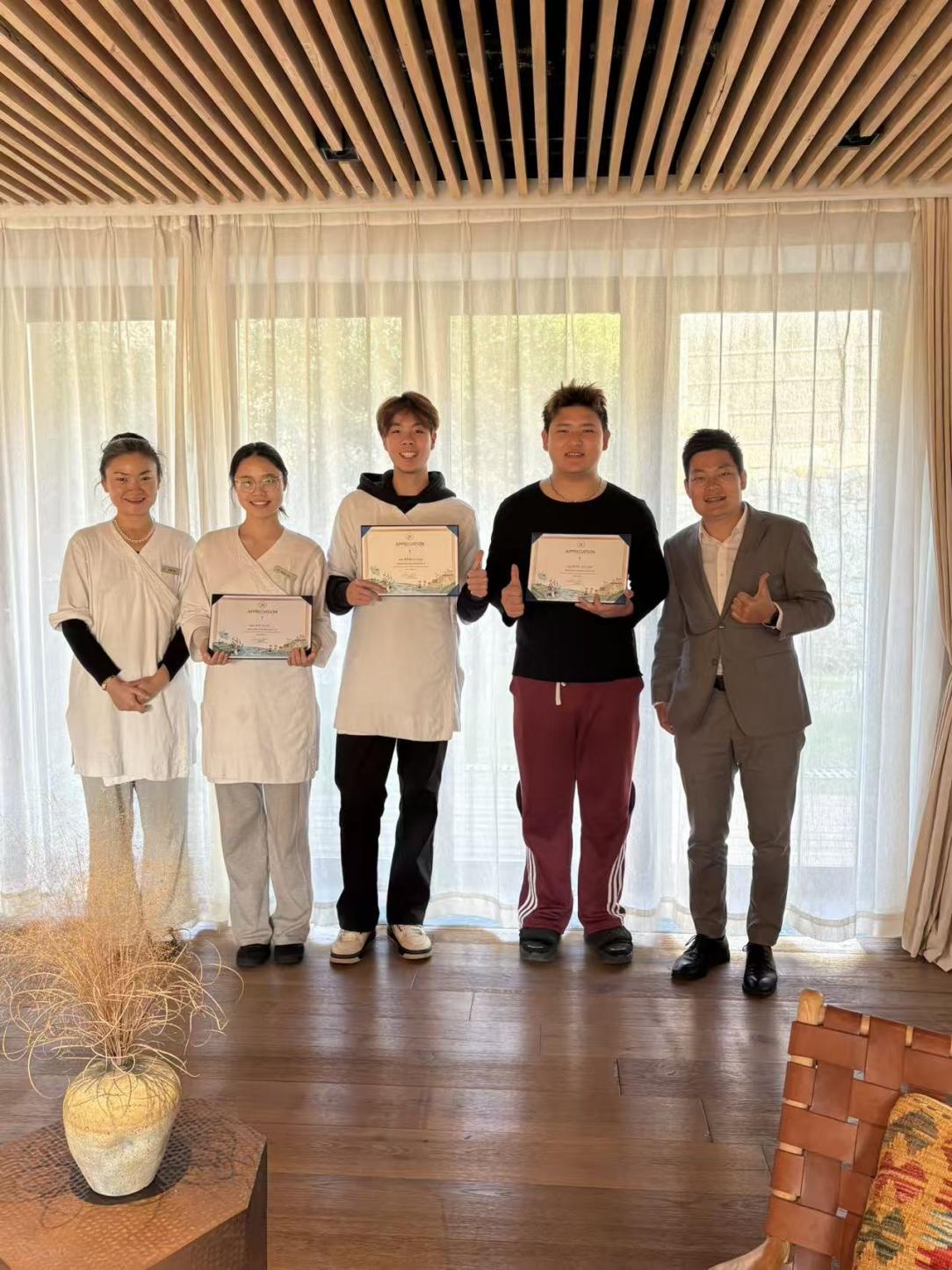 实践期间,学生们不仅扎实完成各项技能学习,还主动参与度假村的康养服务工作,以专业的态度和娴熟的实操能力,赢得了度假村工作人员与宾客的一致认可。实践尾声,三名学生顺利通过技能考核,裸心岭度假村总经理姚海天为同学们颁发实践结业证书,为本次元旦实践学习画上圆满句号。